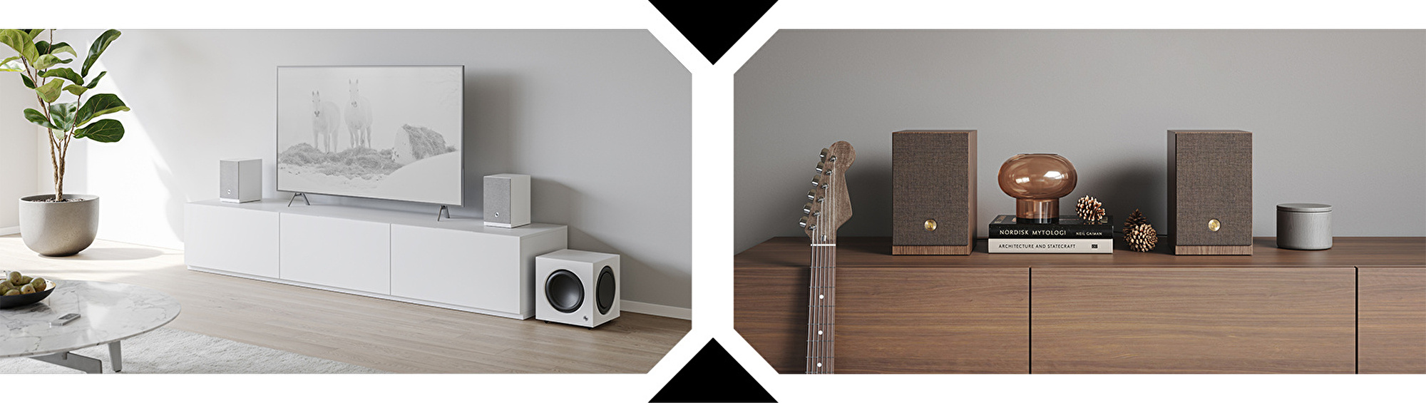 A28 W, zarif MDF gövdesiyle siyah, beyaz veya özel ceviz kaplama seçeneklerinde sunulur. Manyetik olarak sabitlenen kumaş ön paneller kolayca çıkarılarak hoparlöre daha modern bir görünüm kazandırabilir. İsterseniz duvara monte edebilir (bağlantı aparatı ayrı satılır), isterseniz de bir raf üzerine yerleştirebilirsiniz. Bu minimalist tasarım, her türlü iç mekân dekoruna doğal bir şekilde uyum sağlar.