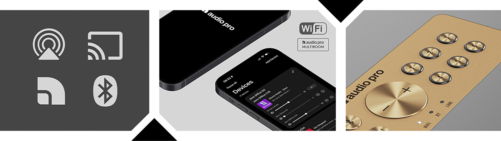 C10 MkII W, Linkplay’in en yeni teknolojisine dayalı uygulama üzerinden çok odalı dinleme özelliğine sahiptir. Ayrıca Google Cast, AirPlay 2, Spotify Connect ve Tidal Connect desteğiyle tüm favori müzik platformlarınıza kolayca erişebilirsiniz. Yeni Audio Pro uygulaması ve hoparlör yazılımı; EQ ayarları, Wi-Fi senkronizasyonu ve çok sayıda yayın hizmetine erişim sunar. Uygulama güncellemeleri mobil mağazanızdan yapılırken, hoparlörün yazılımı otomatik olarak havadan (OTA) güncellenir. 6 adet ön ayar tuşu, favori çalma listelerinize veya radyo istasyonlarınıza anında erişmenizi sağlar. Uygulamayı açmanıza gerek kalmadan sadece bir tuşa basın ve müzik başlasın.