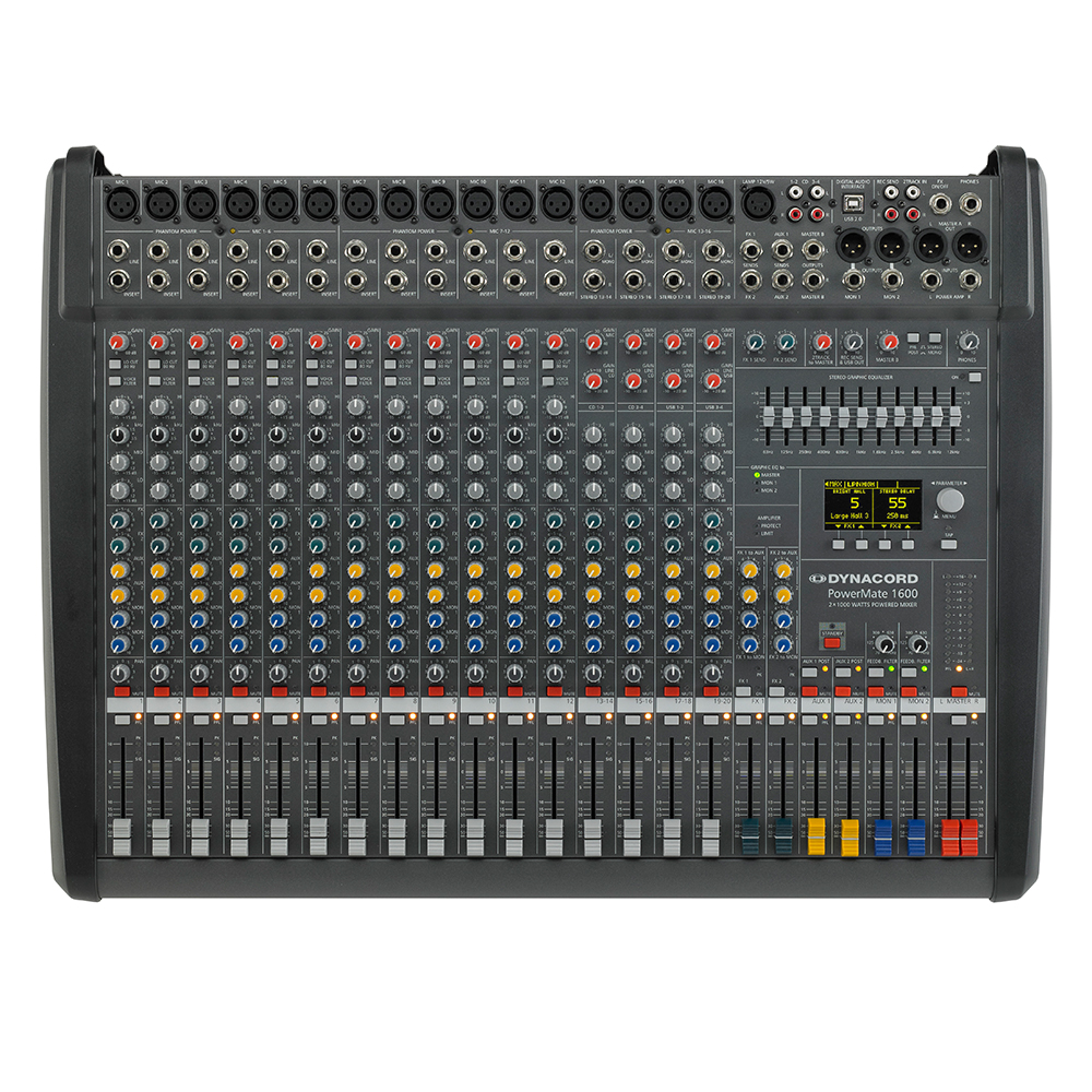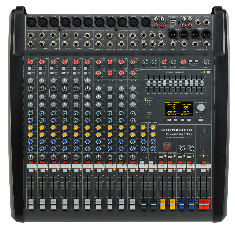PowerMate, tek bir kompakt gövde içinde en az altı ayrı profesyonel ses cihazını bir araya getirir: mikser konsolu, iki efekt ünitesi, grafik ekolayzır, USB ses arayüzü ve güç amplifikatörü. Bu bileşenlerin her biri, bağımsız bir cihazdan beklenen en üst kalite seviyesinde tasarlanmıştır. PowerMate, minimum boyutta maksimum özellik sunarak neredeyse tüm uygulamalar için gerçek bir “her işi yapan” çözümdür. Mikser bölümü, son derece düşük gürültülü 6 adet ayrık mikrofon preamfisi ile başlar. Bunlardan biri pre/post fader seçilebilir olmak üzere 3 adet yardımcı (aux) veri yolu, sahne monitörlemesi için yüksek esneklik sağlar. İki efekt işlemcisi, efsanevi PowerMate reverb’leri de dâhil olmak üzere 100 fabrika preset’i sunar. Ayrıca her preset düzenlenebilir ve 20 kullanıcı hafızasına kaydedilebilir. Dahili USB ses arayüzü, 24-bit / 96 kHz stüdyo standardında bir PC veya Mac ile eş zamanlı olarak 4 oynatma ve 4 kayıt kanalını paylaşır . Ek olarak bulunan MIDI arayüzü, klavyeler gibi enstrümanların sisteme entegrasyonuna olanak tanır. Steinberg Cubase yazılım lisansı paket içeriğine dâhildir. 9 bantlı stereo grafik ekolayzır, hoparlör ve mekân uyumlaması için son derece hassas ton kontrolü sağlar. Güç amplifikatörü, 2 x 1000 W / 4 Ohm (RMS) çıkış gücüyle son derece yüksek performans sunar. Modern anahtarlamalı güç kaynağı ve Class-D çıkış katı sayesinde hem çok verimli hem de hafiftir. Opsiyonel hoparlör koruma sistemi, dinamiklerden ödün vermeden uzun süreli güç sınırlaması yapılmasına imkân tanır. Son olarak, ince yapılı gövde, güçlü mıknatıslı kilitleme sistemine sahip dayanıklı plastik bir kapak ile korunur.