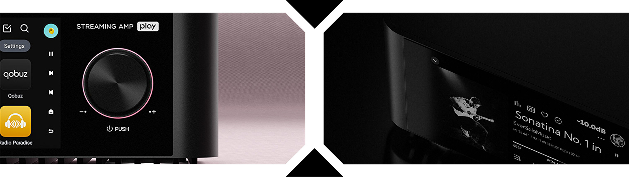 Eversolo Play serisi, TIDAL, Qobuz, IDAGIO, Amazon Music, TuneIn, Deezer, KKBOX ve Radio Paradise gibi önde gelen platformlarla derinlemesine entegre çalışır. Roon Ready, TIDAL Connect ve Qobuz Connect gibi gelişmiş protokoller sayesinde, yüksek çözünürlüklü kayıpsız ses akışı ek cihaza gerek kalmadan doğrudan cihaz üzerinden yapılabilir. Milyonlarca parçaya tek dokunuşla erişim sağlar ve 24-bit/96kHz’e kadar gerçek zamanlı dinleme sunar. Dinamik VU metreleri, müzik akışını görselleştirerek çalma deneyimini daha da etkileyici hale getirir.