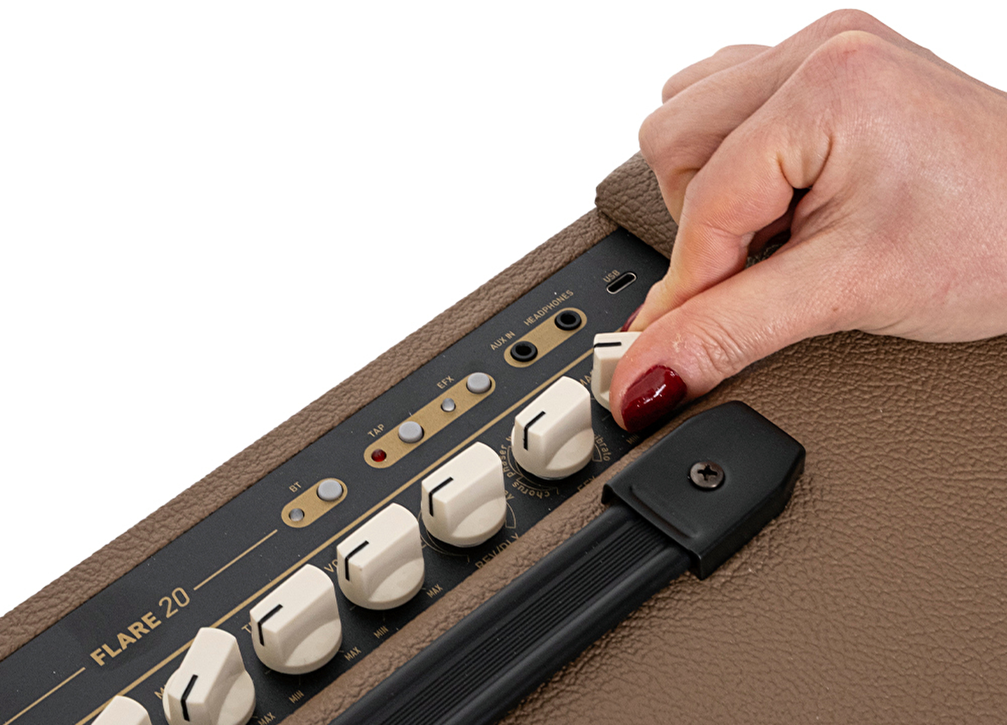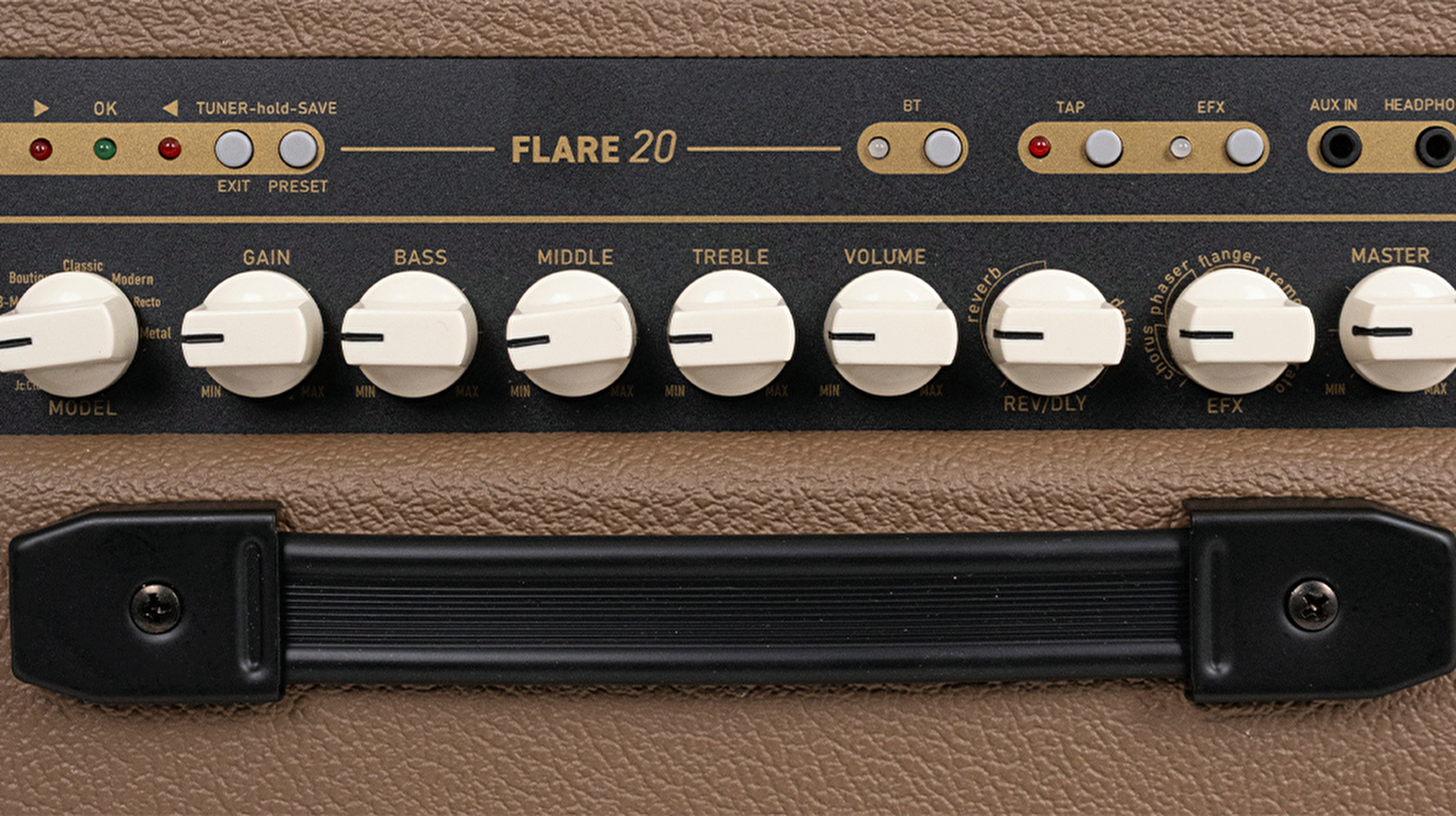FLARE-20; delay ile derinlikli tekrarlar, reverb ile geniş ve doğal bir ortam hissi, chorus sayesinde dolgun ve çok katmanlı tonlar sunar. Phaser ve flanger efektleriyle hareketli ve modern dokular elde edilirken, tremolo ritmik ses dalgalanmaları yaratır; vibrato ise tona karakteristik bir titreşim katarak ifadenizi güçlendirir. Tüm bu efektler bir araya gelerek hem sahnede hem stüdyoda zengin, esnek ve ilham verici bir ses paleti sağlar. Ayrıca Bluetooth ve AUX-in bağlantıları sayesinde backing track’ler eşliğinde pratik yapılabilir, kulaklık çıkışı ile ise sessiz ve konforlu bir çalışma ortamı elde edilir.