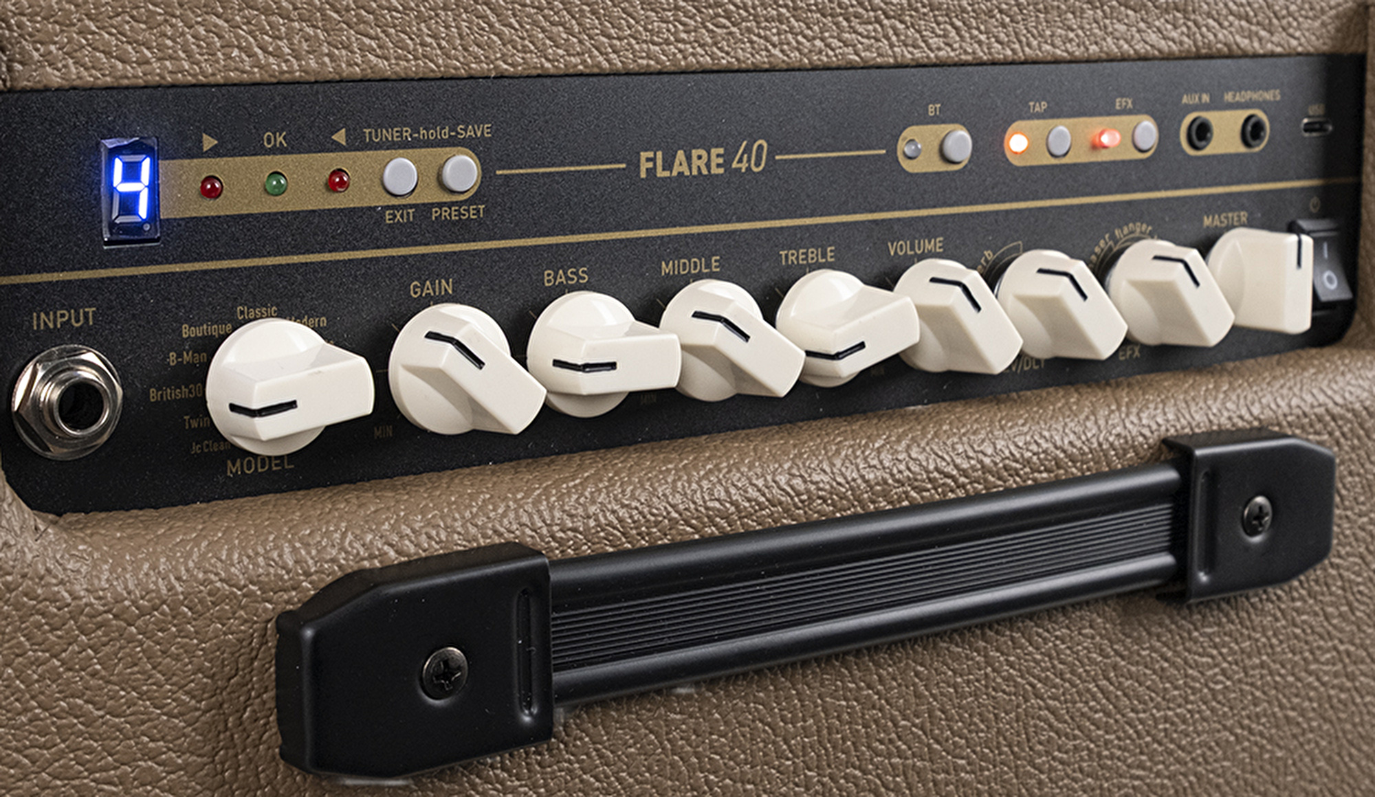 FLARE-40; delay ile derinlikli tekrarlar, reverb ile geniş ve doğal bir ortam hissi, chorus sayesinde dolgun ve çok katmanlı tonlar sunar. Phaser ve flanger efektleriyle hareketli ve modern dokular elde edilirken, tremolo ritmik ses dalgalanmaları yaratır; vibrato ise tona karakteristik bir titreşim katarak ifadenizi güçlendirir. Tüm bu efektler bir araya gelerek hem sahnede hem stüdyoda zengin, esnek ve ilham verici bir ses paleti sağlar. Ayrıca Bluetooth ve AUX-in bağlantıları sayesinde backing track’ler eşliğinde pratik yapılabilir, kulaklık çıkışı ile ise sessiz ve konforlu bir çalışma ortamı elde edilir.