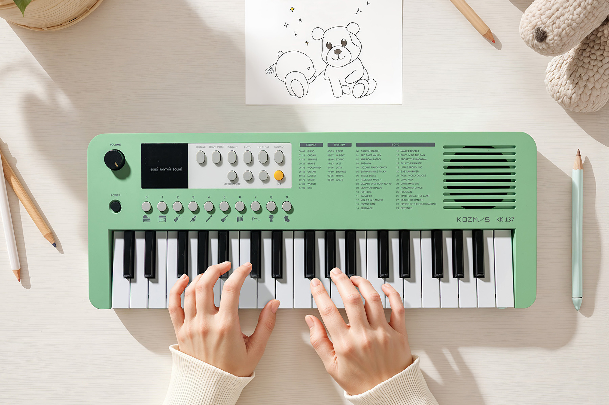 Müziğe ilk adım atan minikler için eğlenceli, öğretici ve ilham verici bir org: KOZMOS KK-137! Kompakt tasarımı, kolay taşınabilir yapısı, renkli seçenekleri ve zengin içerikleriyle çocuklar hem öğrenecek hem de çok eğlenecek. 100 farklı enstrüman sesi, 100 ritim, 30 demo parça ve mini tuş yapısıyla çocuklara özel olarak tasarlandı. Okullar, kreşler veya evde müzikli oyun saatleri için ideal olan bu başlangıç klavyesini dilerseniz adaptörle, dilerseniz de 4 adet AA pil ile her yerde kullanabilirsiniz. Eğlence ve öğrenme bir arada!