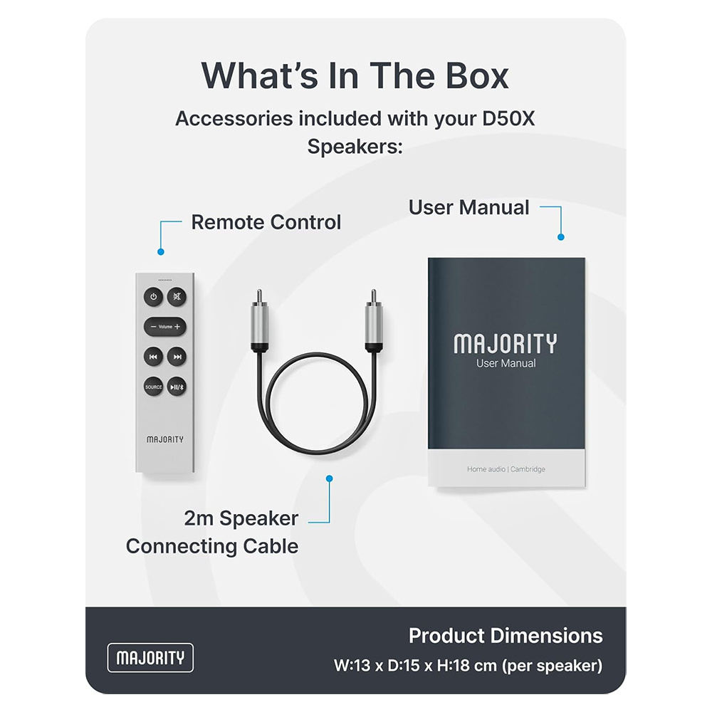 Kutudan çıktığı anda gerçek Hi-Fi ses deneyiminin keyfini çıkarın. Güçlü dahili amplifikatörü sayesinde Majority D50X kablosuz Bluetooth hoparlör sistemi, ek ekipmana ihtiyaç duymadan gerçek stereo Hi-Fi ses sunar. Netlik ve hassasiyet için tasarlanan bu sistem; müzik severler ve film tutkunları için mükemmel bir yükseltmedir. Ayrıca enerji tasarrufu için belirli bir süre kullanılmadığında otomatik olarak bekleme moduna geçen Auto Standby özelliğine sahiptir.