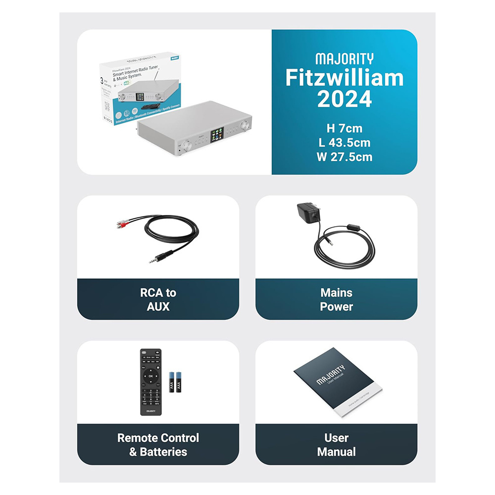 Majority Fitzwilliam 2024 Internet Radio Tuner, dünyanın dört bir yanından 25.000’den fazla radyo istasyonuna erişim imkânı sunarak klasik radyo anlayışını tamamen değiştiriyor. Yerel ve küresel radyo istasyonlarını kolayca dinleyebilir, zengin içerik yelpazesiyle eğlencenin keyfini çıkarabilirsiniz. DAB, DAB+, FM ve internet radyolarının tümü bu kompakt ve şık cihazda bir araya geliyor.