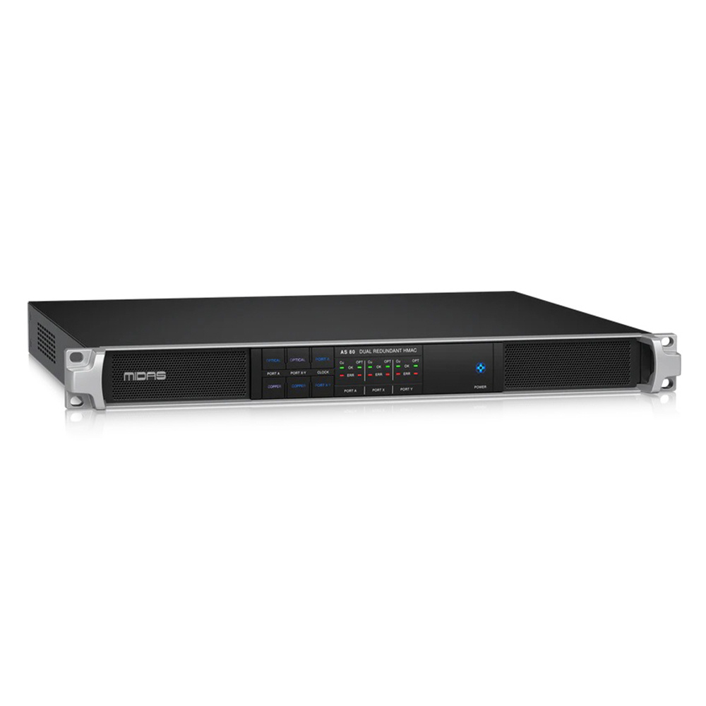Midas AS 80, yüksek hızlı tek bir HyperMac bağlantısını iki yedekli 1GBit bağlantısına ve tersi yönde sorunsuz şekilde dönüştürmek için tasarlanmıştır. Ultra hızlı ses anahtarlaması sağlarken, 96 kHz’de 192 çift yönlü kanala kadar çalışabilir.