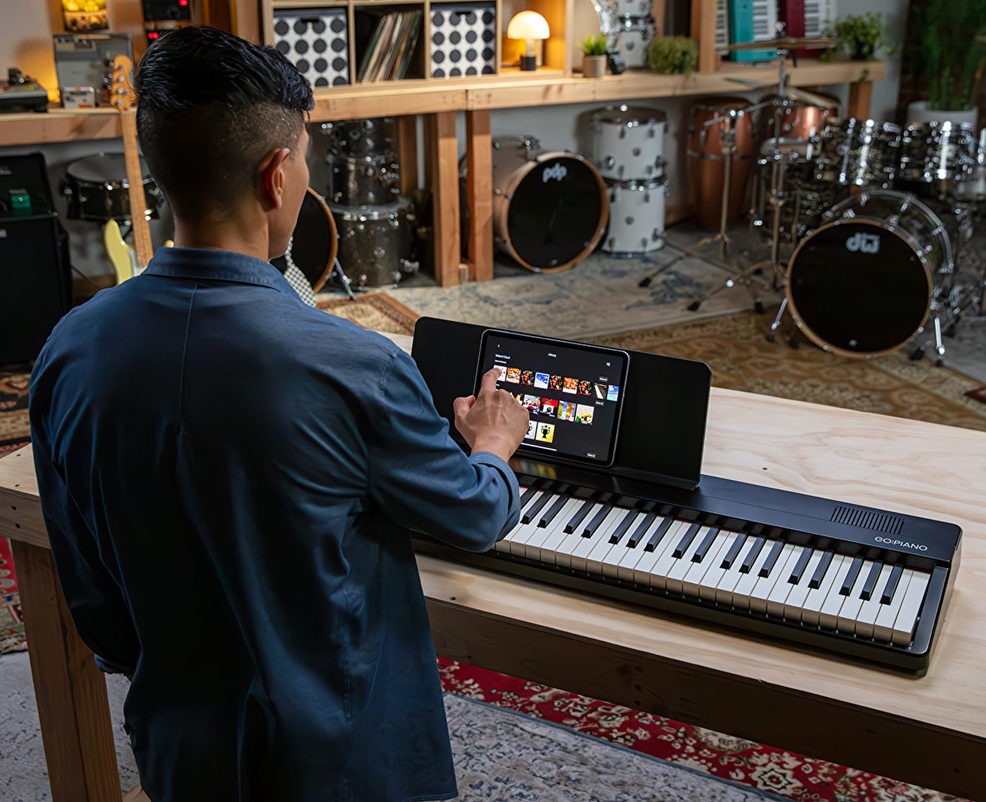 GO:PIANO88, ince yapısı ve sade ztasarımıyla şık bir görünüm ve üstün piyano performansı sunar. İlk kez bir enstrüman çalıyorsanız bile sade ve kullanışlı yapısıyla sizi çalmaya teşvik eder. Akustik kuyruklu piyanolardan ilham alınarak tasarlanan 88 tam boyutlu tuş, gerçekçi bir çalım hissi ve hassas bir dokunuş sunar. Fildişi hissine sahip tuşlar, zarif siyah gövdeyle mükemmel bir uyum içindedir.