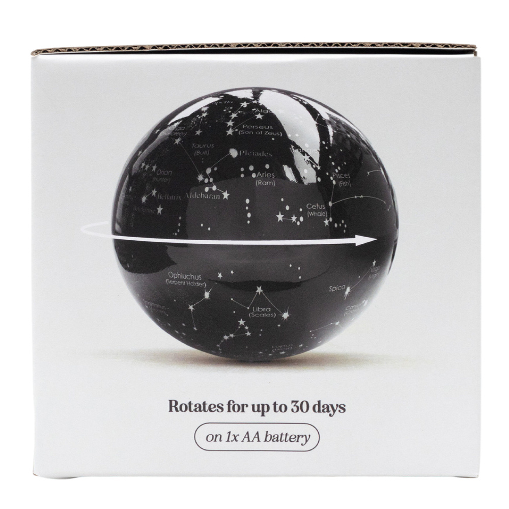 Spinning Light Up Star Map (Revolving Night Sky Globe), uzayı masaüstüne taşıyan hem dekoratif hem de eğitici bir tasarım ürünüdür. Özellikle Suck UK tarafından üretilen bu model, klasik küre (globe) formunu yıldız haritası ile birleştirerek farklı bir deneyim sunar. Bu ürün, üzerinde takımyıldızların yer aldığı küresel bir haritayı döner mekanizma ve LED ışıkla hareketli hale getirir. Tek bir AA pil ile yaklaşık 30 gün boyunca dönmeye devam edebilir ve kurulumunun oldukça basit olduğu belirtilir.